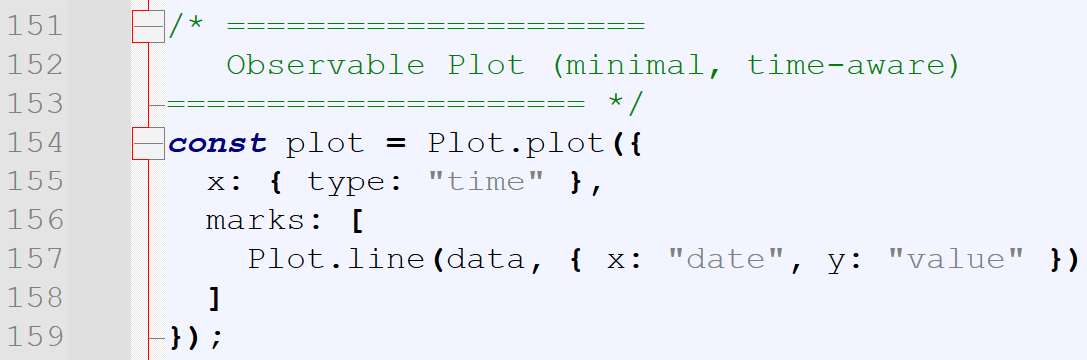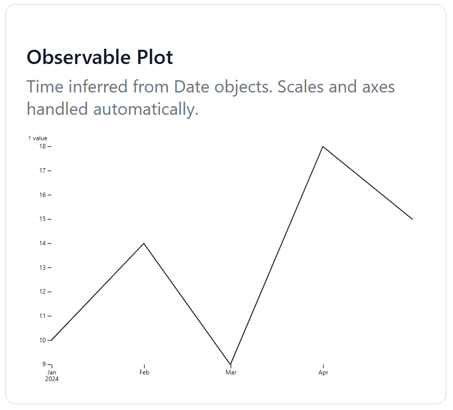 With Observable Plot, the chart emerges fully formed from the data itself. Time is inferred directly from the Date objects. Scales and axes are added automatically, and the result is readable without additional instruction. The chart reflects intent rather than implementation.