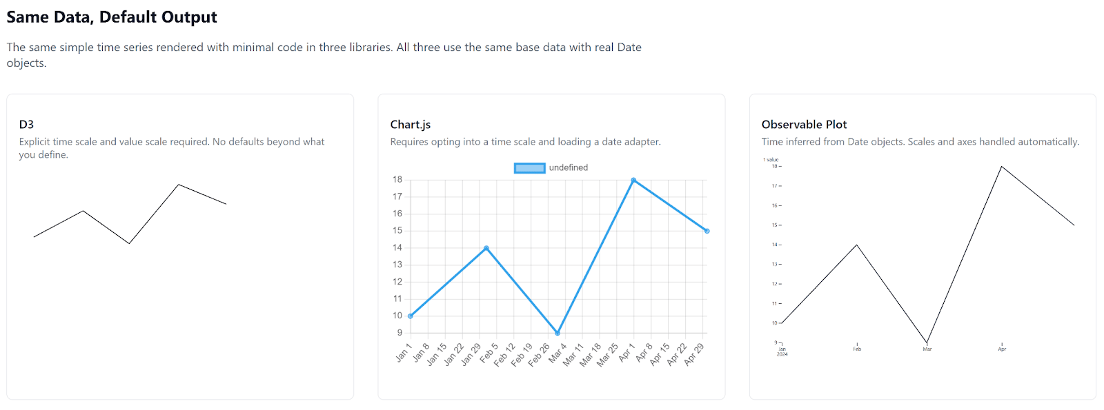 The image above shows the same simple time series rendered three ways, using the same underlying data with real Date values. Nothing has been styled or normalized beyond what each library does by default. The differences you see are the defaults.